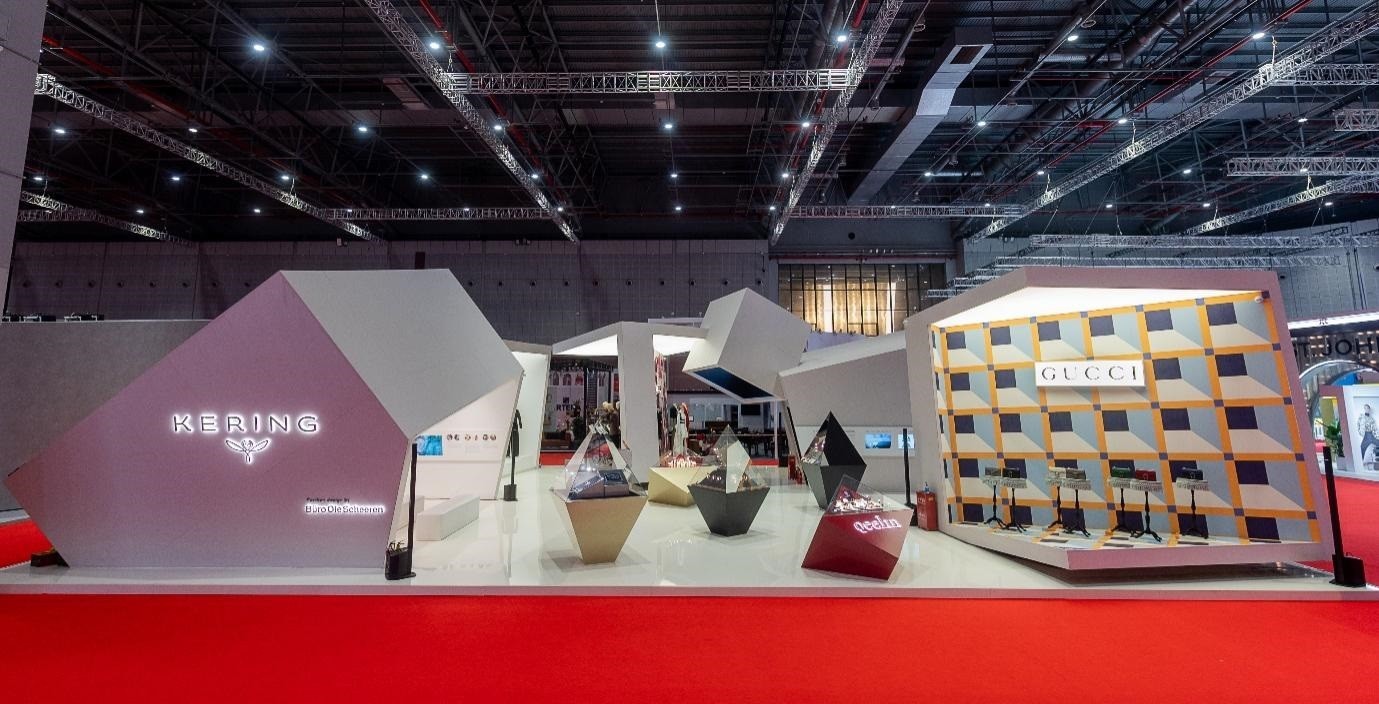 图片说明:2019年第二届中国国际进口博览会“开云馆”以传统“珠宝盒”为灵感,通过将一系列尺寸各异的立方体翻转侧立,并进行错落有致的排列,以类似艺术展览的方式呈现开云集团与旗下品牌,为访客创造了一个引人探索的互动空间。